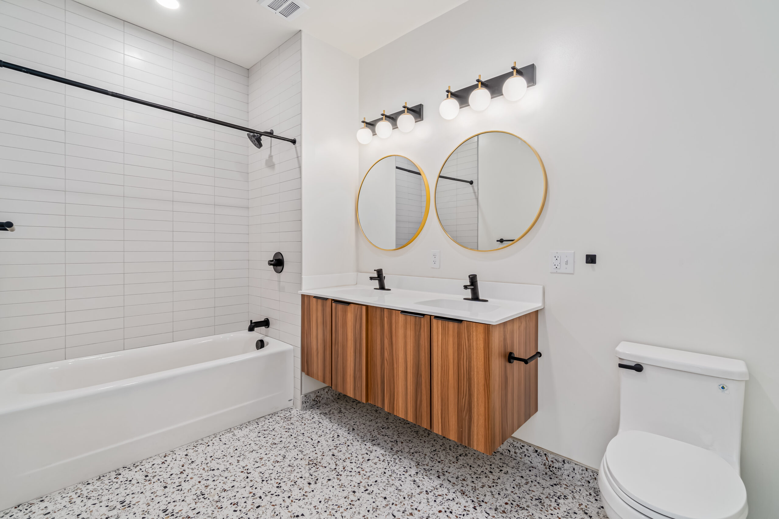 The Polaris Flats blends Timeless Elegance with a Modern Twist featuring traditional ambiance with champagne cabinets, LVP wood floors, and quartz counters. The attention to detail is evident in every aspect, from the terrazzo tile baths to the high-tech Wi-Fi-enabled door locks and appliances, ensuring that residents live in the lap of luxury and connectivity.