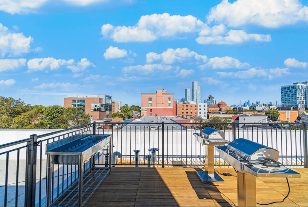 Rooftop Terrace: An outdoor kitchen and stunning NYC skyline views create a perfect entertainment space.